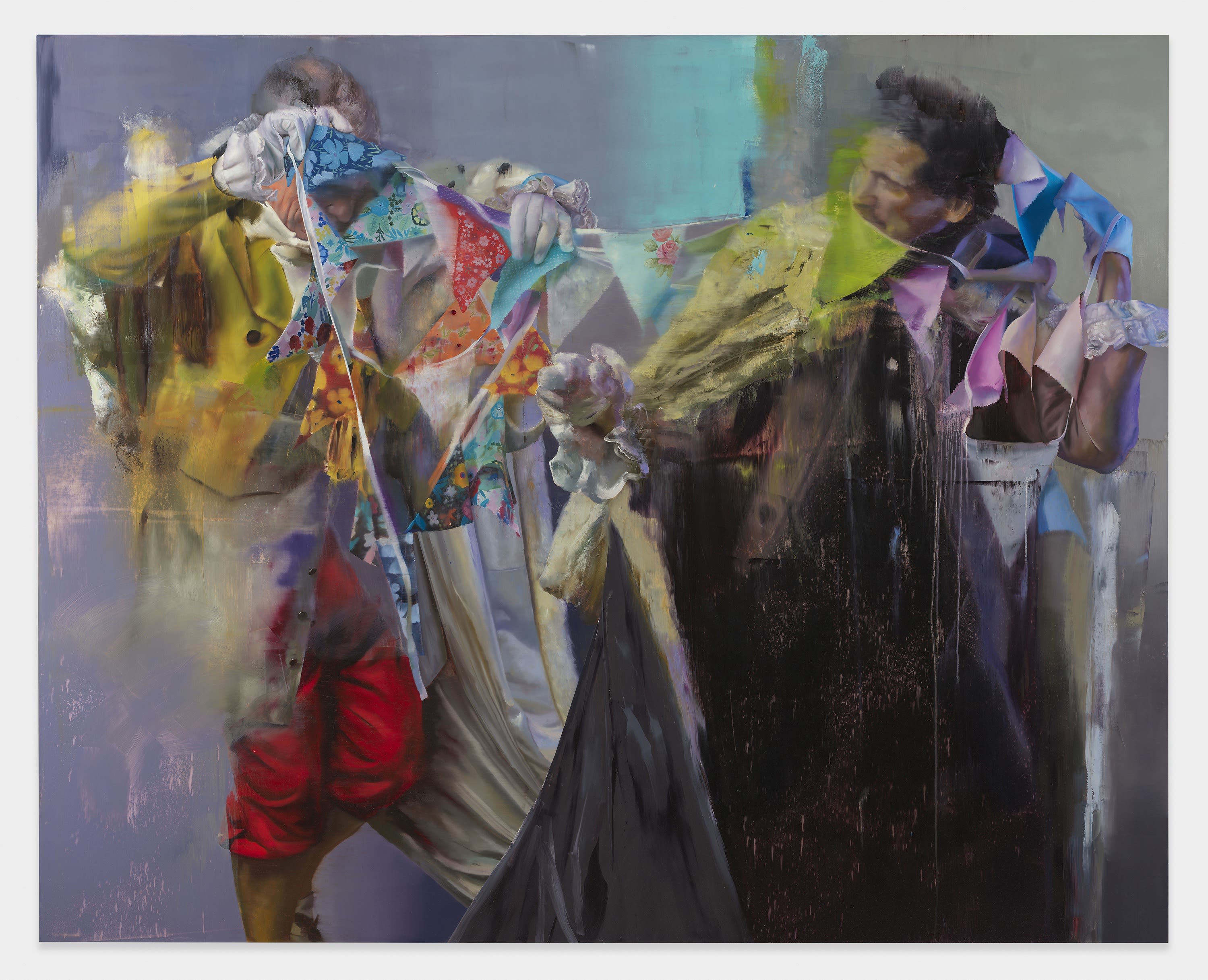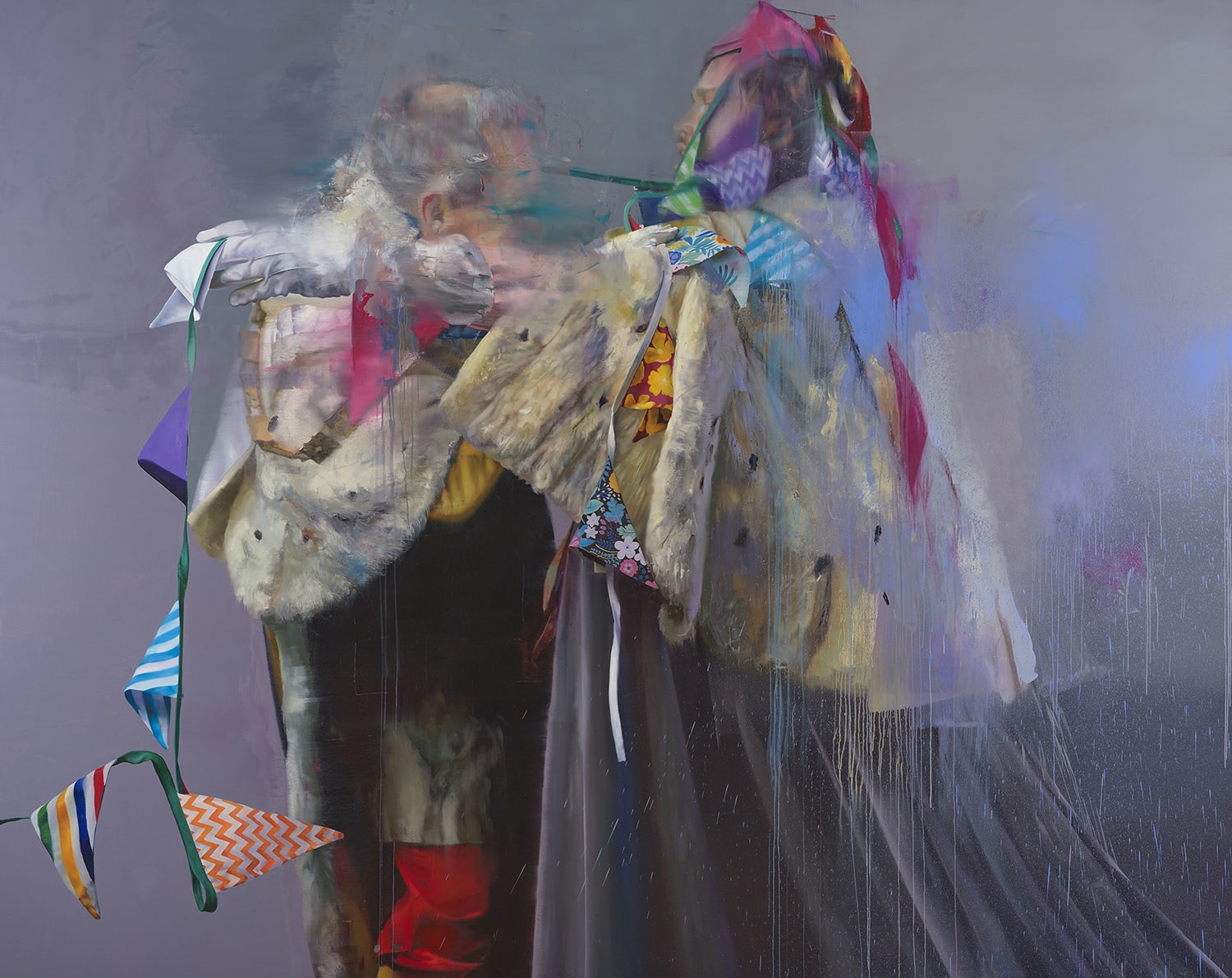 CH: I think my aim was to introduce an incongruous element to the historical costume, something that would be jarring, of another time and for a different purpose than the cloaks and ceremonial garb the men are wearing. I like all the alternative narratives that are suggested when you paint a light-hearted, celebratory bunting – strangling, struggling, and playing with the heavy and austere historical weight of the ermine cloak.